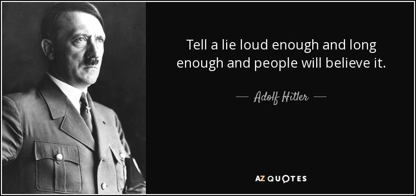 “All propaganda must be confined to a few bare necessities and then must be expressed in a few stereotyped formulas . . . Only constant repetition will finally succeed in imprinting an idea upon the memory of a crowd.” ~ Adolf Hitler